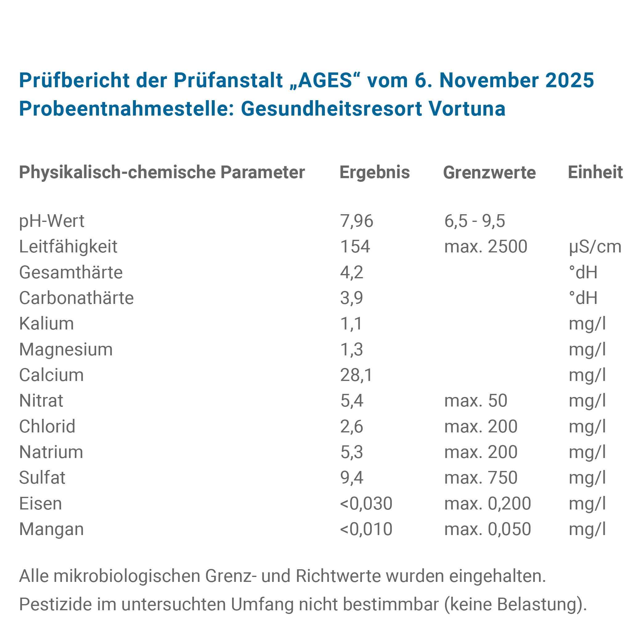 „Wie Sie aus dem Prüfbericht ersehen können, sind wir in der glücklichen Lage, unseren Kunden ausreichend sauberes Trinkwasser zu liefern. Um diesen hohen Qualitätsstandard halten zu können, ist es erforderlich alles zu unternehmen, damit es zu keiner Belastung unseres wichtigsten Lebensmittels Wasser kommt.“